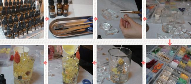 From the front of January candle craft shop, the scent of a pleasant candle gently greets you. There are small candles at the entrance of the shop. The charming and warm atmosphere of the craft shop brought excitement ahead of the one-day class. Inside the shop, there is a room where people can enjoy crafting programs. First, you must take your time choosing the scents of the candle. There are over 30 kinds of scents, and people can pick their own freely. After choosing the scents, cut the gel wax small enough to fit in a candle bottle. If you cut the wax naturally into ice-shaped pieces, you can beautifully decorate the candle.
