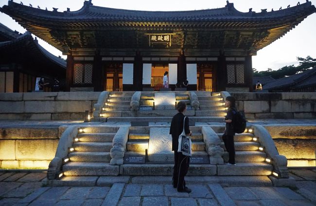 After crossing the Okcheongyo Bridge and moving deeper into the palace, Myeongjeongjeon Hall, the grandest building in Changgyeonggung, comes into view. As the main hall of the palace, Myeongjeongjeon Hall was where the king held important ceremonies and assemblies with his officials. The name 'Myeongjeong' translates to 'bright and upright,' reflecting the virtues expected of a king’s governance. At night, the hall stands even more majestically under the soft glow of lights. Standing in front of Myeongjeongjeon Hall, we could almost imagine the historical moments that took place here, where Joseon kings made significant decisions.