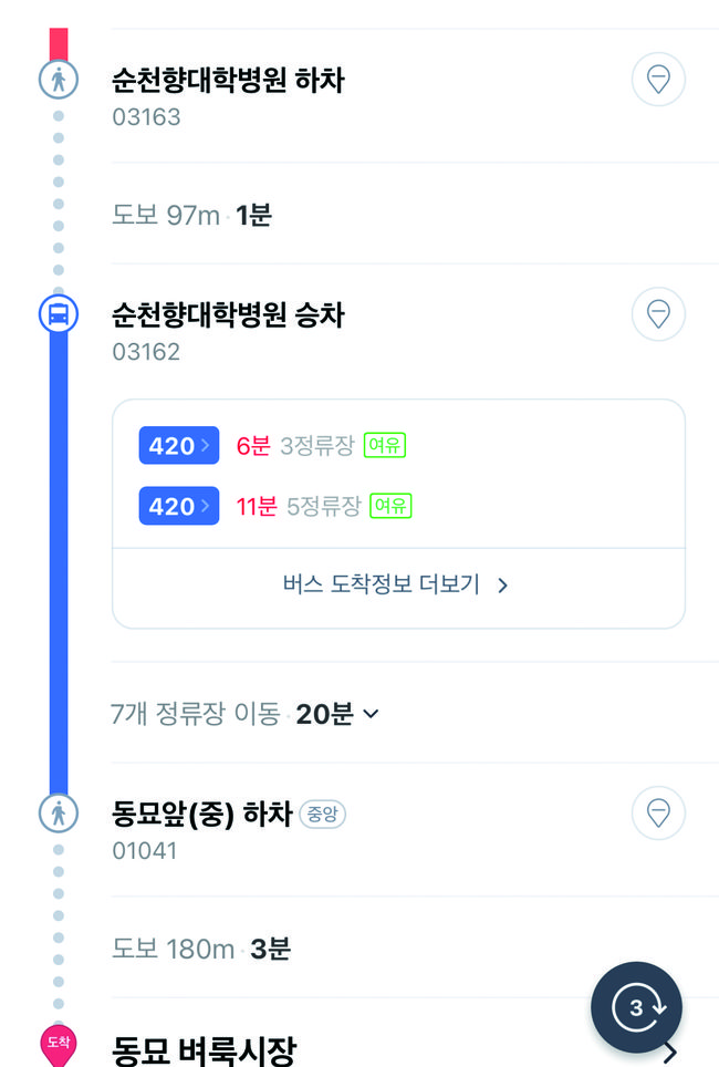 Next, get off the bus at SoonChunHyang University Hospital and transfer to bus No. 420; finally, get off at Dongmyo. It takes about an hour and twenty minutes and costs 3,100 won.
