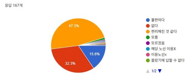 더불어 송내/부평 노선 축소에 대해 묻는 질문 역시 ‘모르겠다 (60.5%)’가 가장 많았지만, 노선 시간 변경과 관련해서는 ‘편리해졌다’(47.2%), ‘불편하지 않다’(33.1%) 등 긍정적 응답이 대부분을 차지했다.