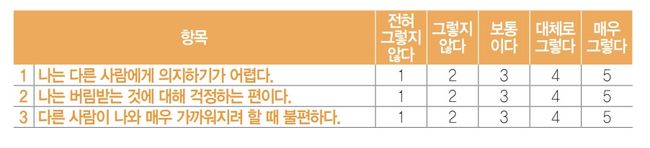 성인 애착 이론에는 △안정 애착 △불안-몰입 애착 △거절-회피 애착 △공포-회피 애착 총 4가지 유형이 존재한다. 이는 ‘성인 애착 유형 테스트’를 통해 확인할 수 있다. 아래 표는 성인 애착 유형 테스트의 일부로, 실제 테스트는 해당 질문을 포 함한 36개의 질문에 5가지로 답하는 형식으로 이뤄져 있다.