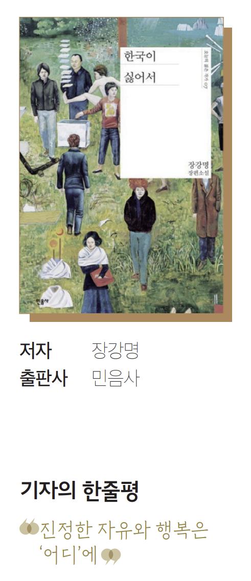 반복되는 하루 속에서 우리는 ‘왜 살아야 하는가’라는 근본적인 질문을 회피한 채 흘러가듯 살아간다. 하지만 지금의 삶을 전부 버리고 다른 곳에서 새로 시작할 수 있다면, 어떤 선택을 할 것인가. <한국이 싫어서>는 바로 주인공의 대담한 결심에서 출발한다. 지난 2015년에 출간된 이 작품은 취업난과 불평등에 지친 청년 세대의 공감을 얻으며 베스트셀러 자리까지 올랐다. 인기에 힘입어 작년, 국내에서 동명의 독립영화로 제작돼 제28회 부산국제영화제 개막작으로 선정되기도 했다. 이후 올해 일본에서도 「ケナは韓国が嫌いで(계나는 한국이 싫어서)」로 상영되며 국경을 넘어선 공감을 끌어냈다. <한국이 싫어서>의 주인공 ‘계나’는 학벌과 재력은 물론, 자아실현의 욕망에 이르는 모든 부분에서 평균 혹은 그 이하의 삶을 살아간다. 무슨 일을 하는 건지 모르겠는 회사와 춥고 가난한 집을 오가며 한국에서는 경쟁력이 없다는 것을 깨닫고 호주로의 이민을 결심한다. 크고 작은 위기들을 극복하고 대학원에 입학해 자리를 잡아가던 계나는 남자친구였던 ‘지명’으로부터 청혼에 가까운 고백을 받는다. 두 달 동안의 방학을 그와 함께 한국에서 지내며 안정적이고 미래가 보장된 지명과의 삶에 흔들렸지만, 다시 호주를 선택한다. 첫 번째 출국은 ‘한국이 싫어서’ 떠난 도피의 길이었다면 두 번째 출국은 ‘행복을 찾기 위한 도전’의 길이었던 것이다.
