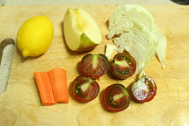 Skin troubles can come up when you have eaten high fat, high carbohydrate foods. It is good to eat fruits and vegetables that have a lot of vitamin C, vitamin A and antioxidants. Ingredients : water (150ml), 2 carrots, ¼ apple, 5 cherry tomatoes, cabbage (100g), lemon juice (2t)