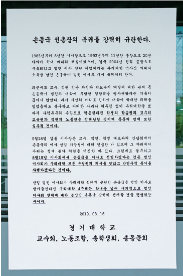Moreover, the student council, a faculty, and the labor union asked the board to deal with the agenda about Mr. Son together at the meeting and the board agreed to it. However, when 3 parties came to the meeting place, they realized that the meeting place was changed to another place, a hotel located in Gang-nam 3 parties headed to the changed meeting place as soon as they knew change, though the board had already finished. The agenda about Mr. Son returning to chairman of the board was passed unanimously. Right after this happened, the student council and students expressed strong rejection by occupying the room of board’s chairman. The occupation has been running 24 hours. Also, 3 parties submitted the related information about his irregularities to the Ministry of Education. When students of Kyonggi University heard of the disrespectful decision that was made by a board meeting, they autonomously articulate their intentions with giving the information to the press and petitioning via internet. The arbitrary decision made by a board meeting, which disregarded the opinions of Kyonggi University members, deserved to be condemned. A board must wake up from the selfish mind that could lead to crisis of Kyonggi University and its members.