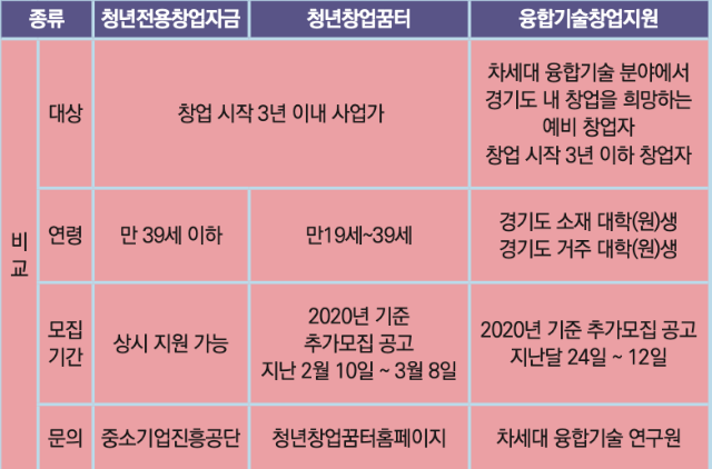 마지막으로 ‘경기도 융합기술 창업지원’을 소개한다. 이 사업은 4차 산업혁명 시대를 이끌 대학생 융합기술 스타트업 육성을 위해 진행된다. 모집분야는 △지능형 헬스케어 △미래형 도시 설계 △차세대 교통시스템 △기타 기술기반 등의 차세대 융합기술 분야이며, 신규 25팀, 후속지원 10팀으로 총 35팀을 지원받고 있다. 이 사업은 경기도 소재 대학(원)생 또는 경기도 거주 대학(원)생 중 경기도내에서 창업을 희망하는 예비창업자 혹은 사업 개시일로부터 3년이 지나지 않은 초기 창업자만이 지원 가능하다. 이에 해당돼도 △중소기업창업 지원법 제 3조 및 동법 시행령 제4조의 업종 △금융기관 등으로부터 채무불이행으로 규제중인 경우 △현재 국세 또는 지방세 체납 등의 경우는 자격이 제한되니 유의하길 바란다.