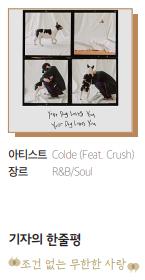 전 세계 반려인들의 눈물 버튼을 누른 노래가 여기 있다. 바로 콜드(Colde)의 ‘Your Dog Loves You’이다. 콜드는 싱어송라이터 겸 프로듀서이자 R&B 듀오 offonoff(오프온오프)의 보컬로 그는 지난 2018년 9월 를 발매하며 솔로 활동을 시작했다. 이후 △ △<이상주의> △ 등 새로운 앨범들을 선보이며 독보적인 장르를 만들어 갔다. 그중 콜드의 ‘Your Dog Loves You’는 콜드가 키우던 반려견 삼나의 입장에서 그에게 편지를 쓴 듯한 가사가 매우 인상적이다. 특히 몽글몽글한 멜로디와 콜드의 목소리가 조화를 이뤄 감미로운 음색을 느낄 수 있다. 피처링에는 싱어송라이터 크러쉬가 참여했는데 그 역시 반려견을 키우고 있어 곡 작업 당시 콜드가 크러쉬에게 키우는 반려견의 입장에서 가사를 써달라고 요청했다고 한다. 그래서인지 가사를 읽다 보면 반려견들이 보여주는 순수한 사랑에 대한 두 반려인의 고마운 마음이 두드러지는 것을 볼 수 있다. 또한 ‘향기로운 풍경’이라는 가사는 좋지 않은 시각에 비해 후각이 발달한 강아지들이 산책할 때 냄새로 풍경을 보는 모습을 표현해냈다. 이렇듯 콜드의 ‘Your Dog Loves You’의 가사는 강아지 시점에서 섬세하게 표현돼 반려인들의 많은 공감과 사랑을 받았다.