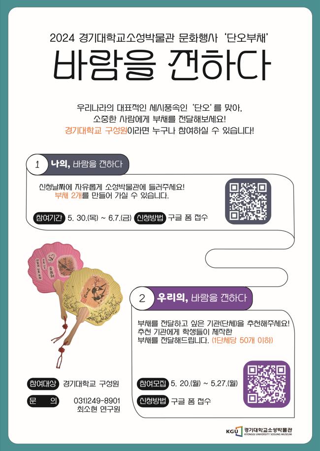 본교 소성박물관에서 <바람을 전하다> 문화행사를 진행한다. 해당 행사는 <나 의, 바람을 전하다>와 <우리의, 바람을 전하다>로 구분된다. <나의, 바람을 전하다>는 부채에 전하지 못한 말을 메시지로 적어 소중한 사람에게 마음을 전하 자는 취지에 따라 박물관 1층 부스에서 2개의 부채를 만들 수 있는 교내 체험 프로그램이다. 희망자는 오는 7일(금)까지 구글 폼 신청서를 작성하고 오전 10시부터 오후 4시 사이에 부스를 방문하면 체험이 가능하다. 다만 수량이 한정돼 있으니 빠른 참여가 필요하다. <우리의, 바람을 전하다>는 교외 프로그램으로 지난달 27일 까지 학생들에게 부채를 전달하고 싶은 기관을 추천받았다. 그중 교외 기관이며 공익 활동을 하거나 도움이 필요한 단체를 선정해 박물관에 서 제작한 부채를 전달할 예정이다.