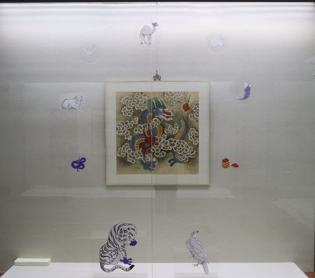또한 ‘나도 큐레이터’로 활동한 한국화전공 양윤지 학생의 작품은 구름 안의, 용 섹션에 전시돼 있다. 해당 작품은 용의 여러 특성을 아홉 가지 동물의 특정 부위에서 가져와 아크릴판을 통해 연출했다. 우리 곁의, 용 섹션에 위치한 「용생구자」 영상 또한 본교 입체조형학과 전설민 학생이 직접 일러스트 제작에 참여해 구현했다.