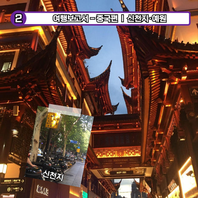 다음 행선지인 신천지는 기자가 여행하며 가장 사랑했던 곳이다. 중국의 작은 유럽이라 불 리는 신천지는 먹거리도 눈요깃거리도 가득한 곳이기 때문이다. 기자는 나무숲들에 둘러싸여 자연의 푸릇함과 선선한 바람을 맞으며 시원한 맥주 한 잔의 여유를 즐겼다. 이후 택시를 타고 무협의 중국을 느끼기 위해 예원으로 향했다. 앞서 방문했던 신천지와는 다르게 예원은 우리 가 평소 생각해 왔던 중국 그 자체였다. 붉은 홍등이 거리 곳곳에 자리한 전통 건축물을 휘감아 몽롱한 사극풍의 분위기를 물씬 풍겼다. 기자도 분위기에 취해 넋을 놓고 풍경만 한참 바라봤다.
