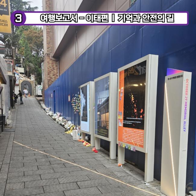 배고픔에 서둘러 지나쳤던 세계음식거리엔 처음 오는 곳이었음에도 기억에 유독 남는 곳이 있었다. 바로 2년 전, 10월 29일. 총 159명이 사망한 이태원 압사 사고의 발생지 ‘기억과 안전의 길’이었다. 수많은 꽃다발이 놓인 골목에 들어서자 늦은 밤 가슴 졸이며 봤던 뉴스들이 생생히 머릿속에 떠올랐다. 언뜻 보면 평범한, 그것도 꽃다발이 없었으면 무심코 지나쳤을 만한 골목길. 이토록 좁은 공간에 그렇게 많은 사람이 존재했다는 것이 믿기지 않았다. 복잡한 생각을 정리하며 괜스레 골목을 쭉 올라가 뱅뱅 돌기도 하고 두 팔을 벌려 거리의 면적을 가늠해 보기도 했다. 벽면을 수놓은 추모글들에 기자도 잠시 한 명의 시민으로 돌아가 포스트잇으로 마음을 덧대고 골목길을 빠져나왔다.