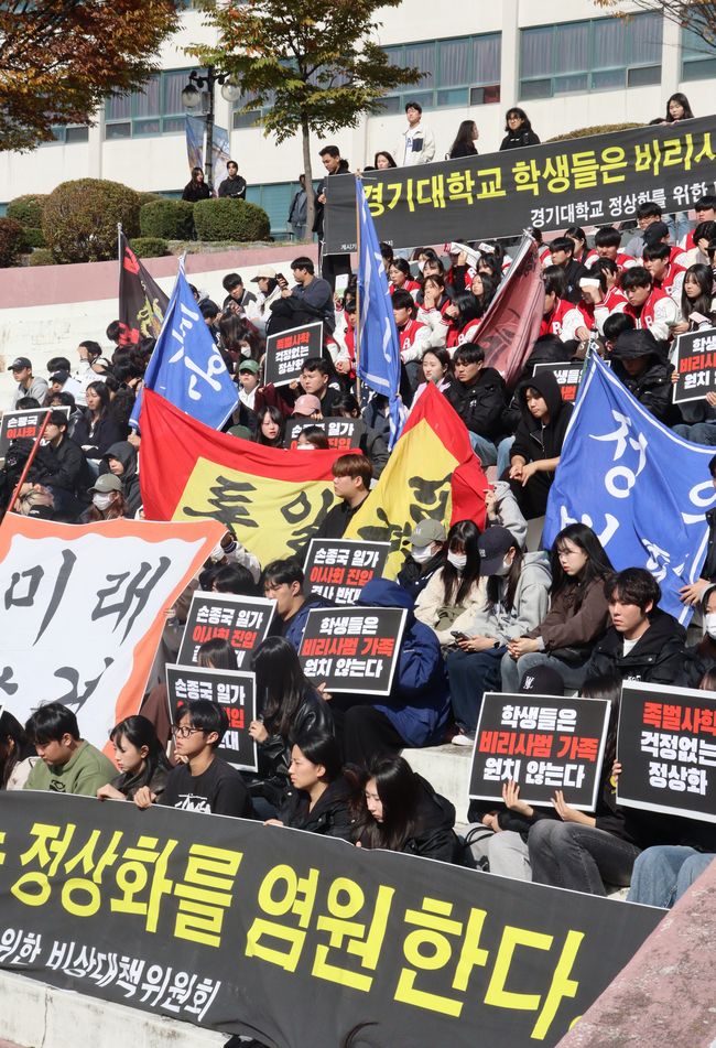 지난달 28일 진행된 시위 이런 상황 속 지난달 14일 본교 내 올바른 정상화를 위한 학생비상대책위원회(이하 비대위)가 꾸려졌다. 비대위를 중심으로 지난달 28일 제222차 사분위 심의에 앞서 약 40명에 달하는 학생이 여의도 TP 타워 입구에서 시위를 벌였다. 이후 지난달 30일 본교 익명 커뮤니티 에브리타임에 ‘가정폭력범을 학교 경영자로 인정할 수 없다’며 손씨 일가를 비롯한 구재단의 퇴진을 요구하는 입장문을 게재하기도 했다. 또한 지난 4일 오전 11시 정부세종청사 교육부 앞에서 기자회견을 진행했다.