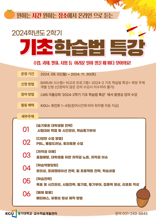 ‘기초학습법 특강’은 다양한 주제에 대한 학생 맞춤형 학습 방법 개발 및 지원에 대한 필요성이 대두되며 개설됐다. 이는 본교 구성원을 대상으로 효과적이고 체계적인 학습전략 안내 및 적용을 돕는다. 해당 프로그램은 1년에 한 번 진행되는 학습 지원 수요 조사를 통해 학생들의 요구사항을 분석한 데이터를 바탕으로 기초 수준의 학습법에 대한 콘텐츠를 제공한다. 학기 중에는 약 20개 정도의 강의가 진행되며 계절학기에는 약 5개 정도 운영된다. 본교 BARUN 시스템을 통해 오는 30일(토)까지 신청 가능하며 본교 LMS에서 모든 콘텐츠를 온라인으로 시청할 수 있다. 신청 시 필요한 별도의 서류는 없으며, 콘텐츠 시청 후 프로그램 만족도 조사를 완료할 시 수강한 강의당 KGU+ 포인트 1~4점을 받을 수 있다.