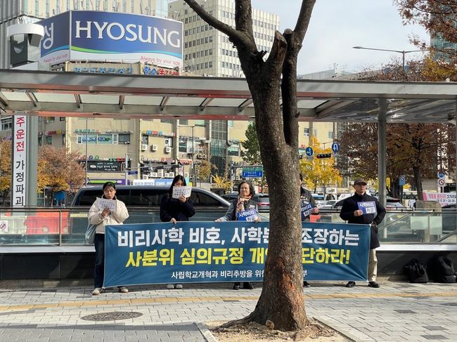 On November 25th, the 224th Private School Dispute Resolution Committee was held. Accordingly, a demonstration for the normalization of the board was held in front of the Yeoui-do TP Tower. It was held by the Kyonggi University Normalization Emergency Planning Committee from 13:20 to 14:00. Three students of Kyonggi University participated, and three people from Sa-hak-guk-bon(사립학교개혁과 비리추방을 위한 국민운동본부). Sa-hak-guk-bon is interested in the return of the previous foundation members. They had demonstrated with the Kyonggi University TF before, in 2014. A summary of the statement by the three students is as follows.