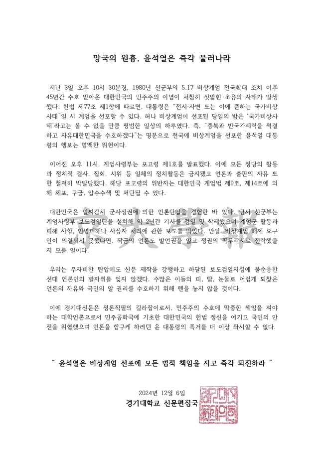 이에 경기대신문은 정론직필의 길라잡이로서, 민주주의 수호에 막중한 책임을 져야 하는 대학언론으로서 민주공화국에 기초한 대한민국의 헌법 정신을 어기고 국민의 안전을 위협했으며 언론을 함구케 하려던 윤 대통령의 폭거를 더 이상 좌시할 수 없다.