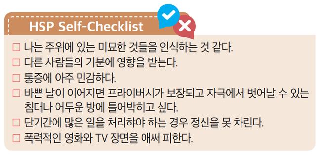 ‘매우 예민한 사람’이라 하면 성격에 문제가 있는 듯 느껴지지만, 그저 일반적인 성격 유형 중 하나일 뿐이다. 그러니 예민함 때문에 힘들어하고 있는 독자가 있다면 사회적으로 결함이라 여겨지는 부분을 있는 그대로 받아들이고 자신만의 방법으로 소화해 보는 건 어떨까.