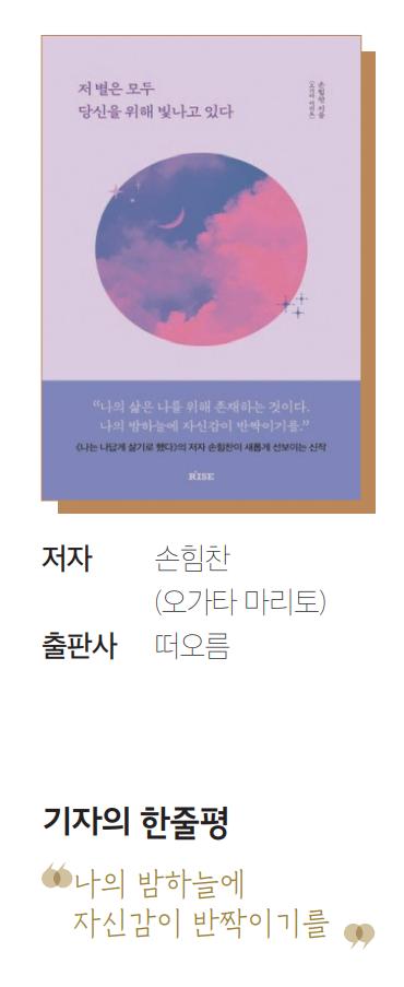 <저 별은 모두 당신을 위해 빛나고 있다>의 저자 손힘찬(오가타 마리토)은 한국과 일본 혼혈이라는 이유로 차별당하며 많은 상처를 받아왔다. 하지만 그는 편견을 깨기 위해, 또 현실 앞에서 희망을 건네고자 매일 글을 작성했다. 그는 글을 쓰며 “밤하늘 아래 작은 등불처럼 사람들에게 희망의 말을 건네고 싶다”고 전했다. 이후 손힘찬은 <오늘은 이만 좀 쉴게요>, <나는 나답게 살기로 했다>를 발간했고 요즘 유행하는 힐링 에세이 형태로 인해 사람들의 주목을 받았다.