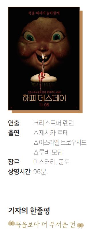 결국 삶은 시간이 쌓이는 것과 같다. 기자는 이 사실을 몰라 항상 시간이 멈췄으면 좋겠다고 생각했었다. 특히 이곳, 신문사에 있을 때면 더욱 그랬다. 기사를 쓰기에 시간이 부족해 차라리 오늘이 반복됐으면 좋겠다고 생각한 적도 있었다. 하지만 영화와 달리 기자의 시간은 멈추지 않았고, 편집국장이라는 자리까지 앉게 됐다. 스스로 성장을 이뤘다고 생각한다. 그래서일까, 만약 <해피 데스데이>의 트리처럼 하루가 반복되는 채로 살아갔다면 지금의 기자가 됐을지 의문이 든다. 기자처럼 흘러가는 시간이 아까웠을 수도 있다. 그럴 때는 본인의 삶을 되돌아보자. 어쩌면 의미 없던 시간은 전부 지금의 당신을 이루고 있을지도 모른다.