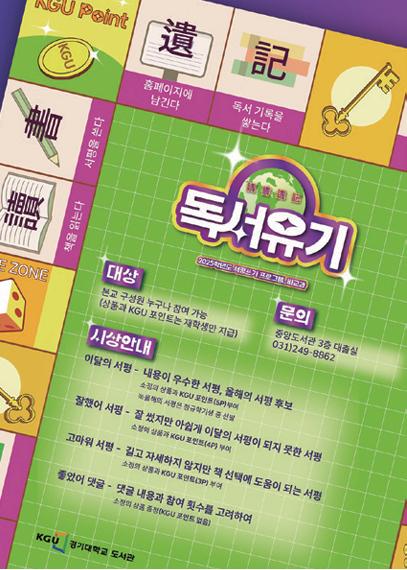본교 중앙도서관에서 ‘2025 讀書遺 記(독서유기) : 서평쓰기’를 상시 신청 받는다. 본 프로그램은 본교 중앙도서 관 홈페이지에서 볼 수 있는 책에 대 한 정보의 다양성을 확보하고 선택하 는 데 있어 도움을 주고자 기획됐다. 본 프로그램은 홈페이지에 로그인한 후 희망 도서를 선택해 상세 페이지에 서 서평을 작성하면 신청할 수 있다. 본교 구성원이라면 누구나 참여 가능 하며, 서평 외에도 댓글을 통해 서평에 대한 감상을 남기면 참여 완료 된다. 제출된 서평은 매월 1일부터 말일까지 취합해 심사를 진행한다. 심사 부문은 총 4개로, △이달의 서평 △잘했어 서평 △고마워 서평에 선정될 시 토이 카메라, 무선마우스 등 소정의 상품과 함께 최소 3점 에서 최대 5점의 KGU+ 포인트가 지급된다. 댓글 참여의 경우 좋았어 댓글로 선정될 시 소정의 상품으로 간식을 제공받는다.