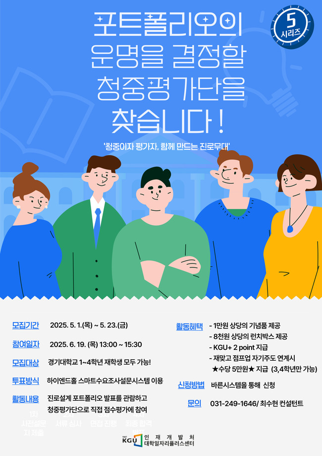 오는 23일(금)까지 본교 대학일자리 플러스센터에서 ‘진로설계 포트폴리오 경진대회 청중평가단’을 모집한다. 청 중평가단은 재학생들에게 진로설계의 객관화 및 수정·보완의 기회를 제공하 기 위해 기획됐다. 재학생 맞춤형 고용 서비스(이하 재맞고) 참여 재학생이라 면 별도의 서류 없이 본교 BARUN 시 스템을 통해 신청할 수 있다. 청중평가 단에 참여할 시 다음 달 19일(목)에 진행되는 ‘진로설계 포트폴리오 경진대회’에서 전문 심사위원과 함께 후보자들의 발표를 다면적으로 평가하게 된다. 대회에서는 총 10명의 후보자가 발표를 진행하 경기대보도 청중평가단 모집, 내가 직접 평가하는 진로설계며, 청중평가단과 전문 심사위원이 각각 점수를 매겨 합산한 결과로 최종 순위를 결정한다. 청중평가단 참가자에게는 △기념품 △ 런치박스 △KGU+ 포인트 2점이 제공된다. 3·4학년의 경우 청중 평가단과 재맞고 점프업 프로젝트 연계 시 수당 5만 원이 부여된 다. 이번 대회는 △웹툰 △영상 △인터뷰 등 정해진 양식 없이 다 양한 형식의 발표 자료를 허용하기에 참여 시 창의성과 개방성 평가에 주목해야 한다는 점을 참고하길 바란다.