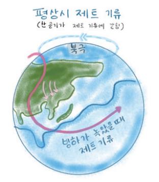 지구온난화가 진행 중이라면서 왜 겨울은 더 추워지는 것일까? 전문가들은 ‘제트기류의 약화’가 근본적인 원인이라고 설명한다. 제트기류는 대류권 상부나 대류경계면 부근에 존재하는 풍속 20m/s 이상의 강한 편서풍대로, 정상적인 기후 순환을 책임지고 있다. 북극과 중위도의 온도 차이로 인해 발생하며 지구 온도를 조절하는 중요한 역할을 한다. 여름철에는 차가운 공기와 따뜻한 공기를 섞어 여름철의 폭염을 조절하고 겨울철에는 북극에서 내려오는 차가운 공기를 막아 한파를 줄여주는 것이다. 특히 북극에서 내려오는 찬바람을 제트기류가 막아준다.