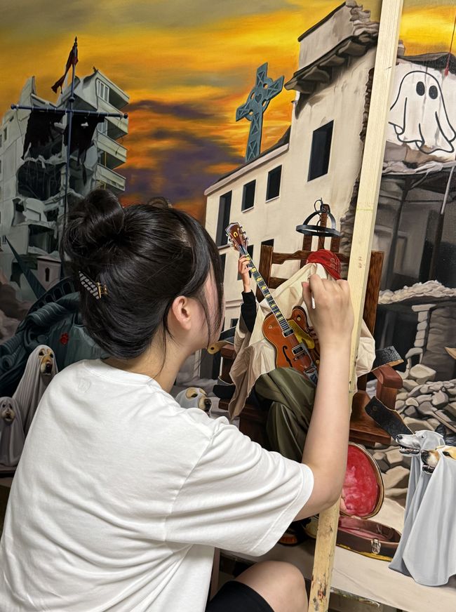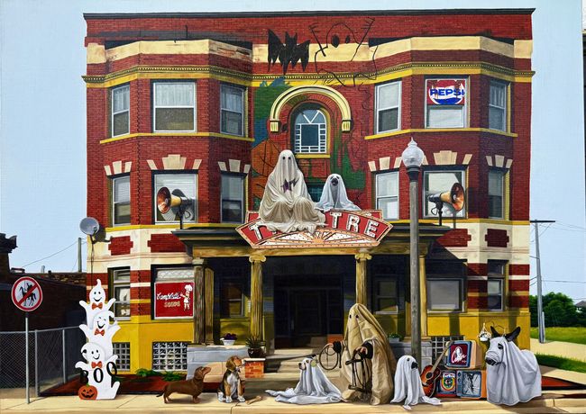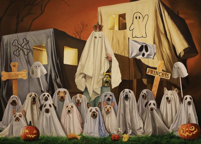 A: One of the main features of my work is that it shows people and dogs dressed as ghosts. My paintings are set in a dystopian, apocalyptic world, and I use the symbol of a ghost to express memories and longing for lost beings.