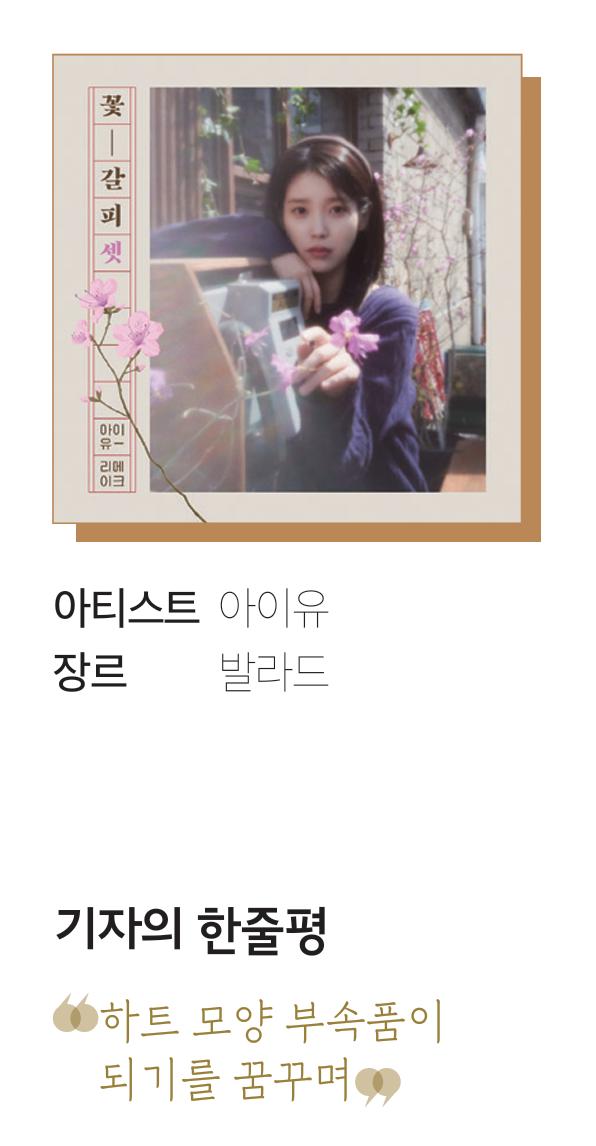 수많은 아이유의 앨범 중에서도 그의 생일인 2014년 5월 16일에 맞춰 공개한 첫 리메이크 앨범 ≪꽃갈피≫는 발매와 동시에 찬사를 받으며 큰 인기를 끌었다. 이 앨범을 시작으로 이어진 ‘꽃갈피’ 시리즈는 아이유의 음악 세계를 대표하는 작품 중 하나로, 그 시절 향수를 불러일으키는 앨범이라 평가받는다. 특히 첫 번째 시리즈에 이어 지난 2017년 9월에 발매한 ≪꽃갈피 둘≫에는 ‘뮤지션 아이유’가 녹아들어 있다.