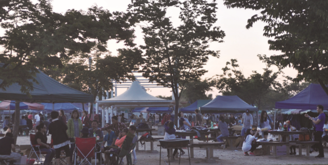 (PM 9:40) 다음날 오전수업이 있는 친구들 이 있었기에, 우리는 오후 10시가 되기 전 뒷정리를 시작했다. 입장 팔 찌를 받을 때 함께 구매한 ‘한강 규격봉투’에 쓰레기를 담고 남은 음식 물은 따로 모아 텐트촌 근처에 위치한 음식물 전용 쓰레기통에 버렸다. 대여했던 물품은 수레에 담아 대여소에 반납하면 된다. 대여소 직원이 대여물품을 모두 깨끗이 씻기 때문에 반납 절차는 매우 간단하다. 한 편, 퇴실 시간은 다음날 오전 9시 30분까지였기에 아직까지 캠핑장에 남아있는 시민들이 많았 다. 그들의 캠핑은 지금부 터 시작인 것처럼 여전히 활기찼다. 그 모습을 보며 지금 돌아가야 하는 우리 의 상황이 내심 아쉬웠다.
