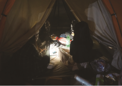 (PM 8:00) 캠핑하면 떠오르는 많은 이미지 중 하나는 바로 텐트 안에 앉아 도란도란 이야기를 나누는 것이 다. 배부르게 밥을 먹은 우리는 텐트로 들어갔다. 텐트 바닥이 나무판 자로 이뤄져있어 평평해 앉기 좋았고, 청소도 깔끔하게 돼있었다. 우 리는 텐트 안에 빙 둘러 앉은 후 휴대폰 손전등을 켜 텐트 바닥 중앙에 놓고 그위에 사이다 페트병을 올렸다. 은은한 초록빛 조명이 어두운 내 부를 밝게 만들었다. 초록색 불빛 속에서 우리는 가수 테이의 ‘같은 베 개’부터 아이돌 그룹 워너원의 ‘에너제틱’까지 다양한 장르의 노래를 틀 며 한 시간 반가량 이야기꽃을 피웠다. 4인실 텐트에 6명이 들어갔기 때문에 다소 비좁았지만 캠핑을 즐기는 데 큰 문제는 되지 않았다.